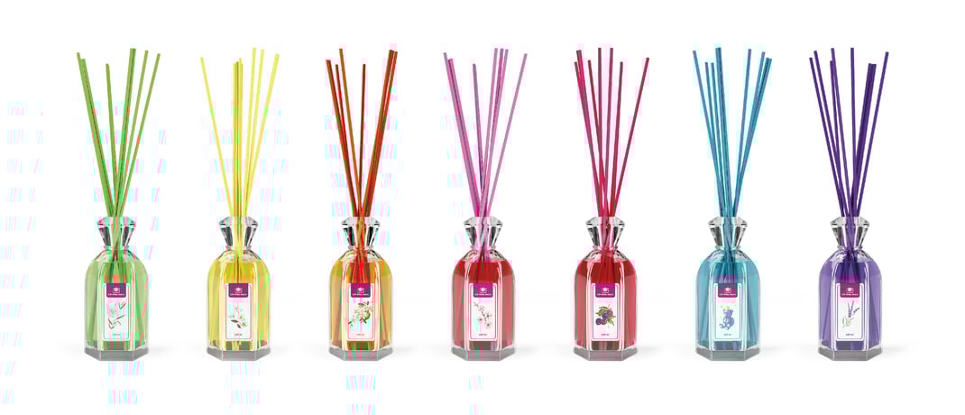 Cat: “Tarongina i Mandarina”. Una aroma fresc que et transporta a un jardí de tarongers en ple estiu. Aquesta aroma disposa una sortida fresca, cítrica, molt expansiva sobre un cos flor de taronger (tarongina), per donar pas a un fons afustat i dolç de la mandarina. Disponible en 3 formats: mida de 180 ml (16 setmanes) i mida de 90ml (12 setmanes). Botella Vidre. Inclou canyetas difusores de rattan. També disponible en format recanvi de 90ml en botella de plàstic i sense canyes de rattan.